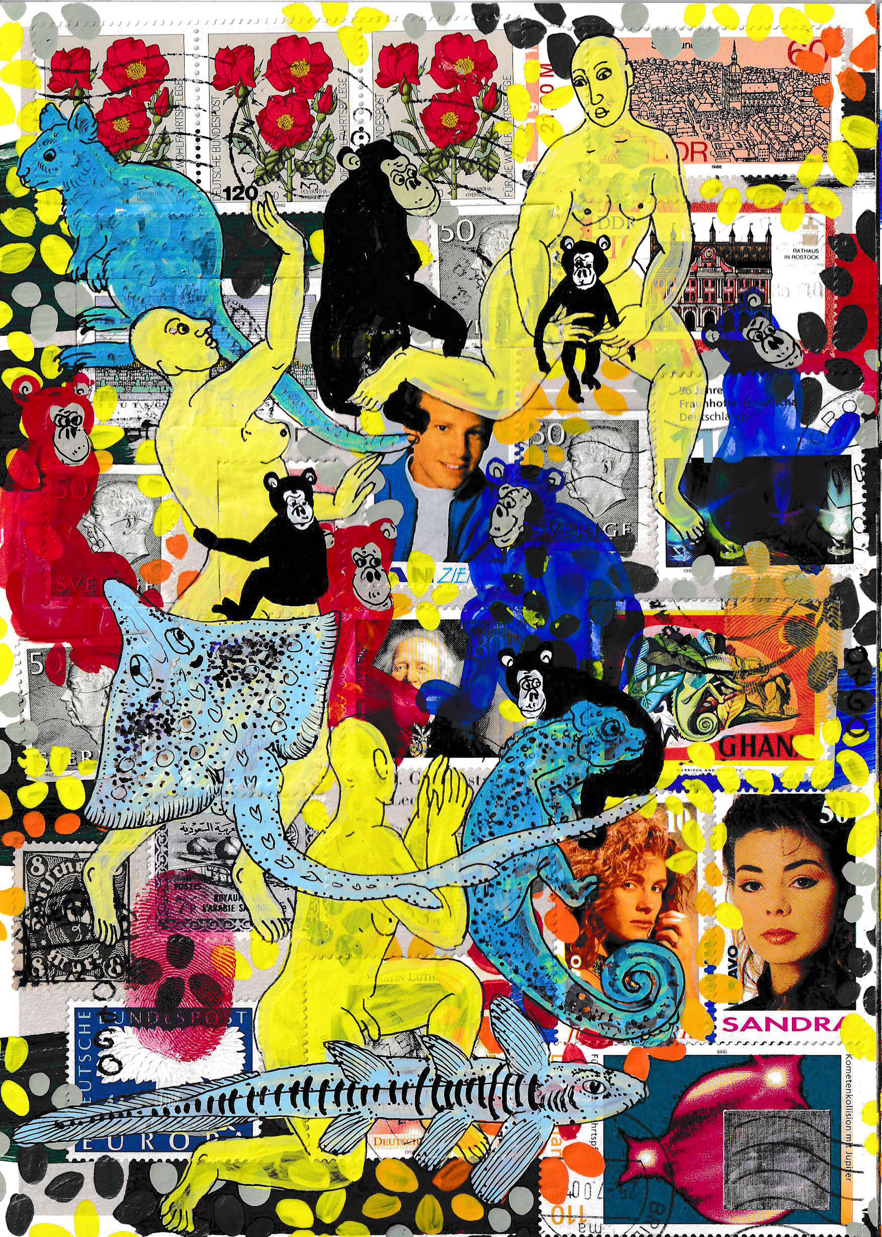 of 54 equal-sized single paintings, ink and acryl on original Stamps,