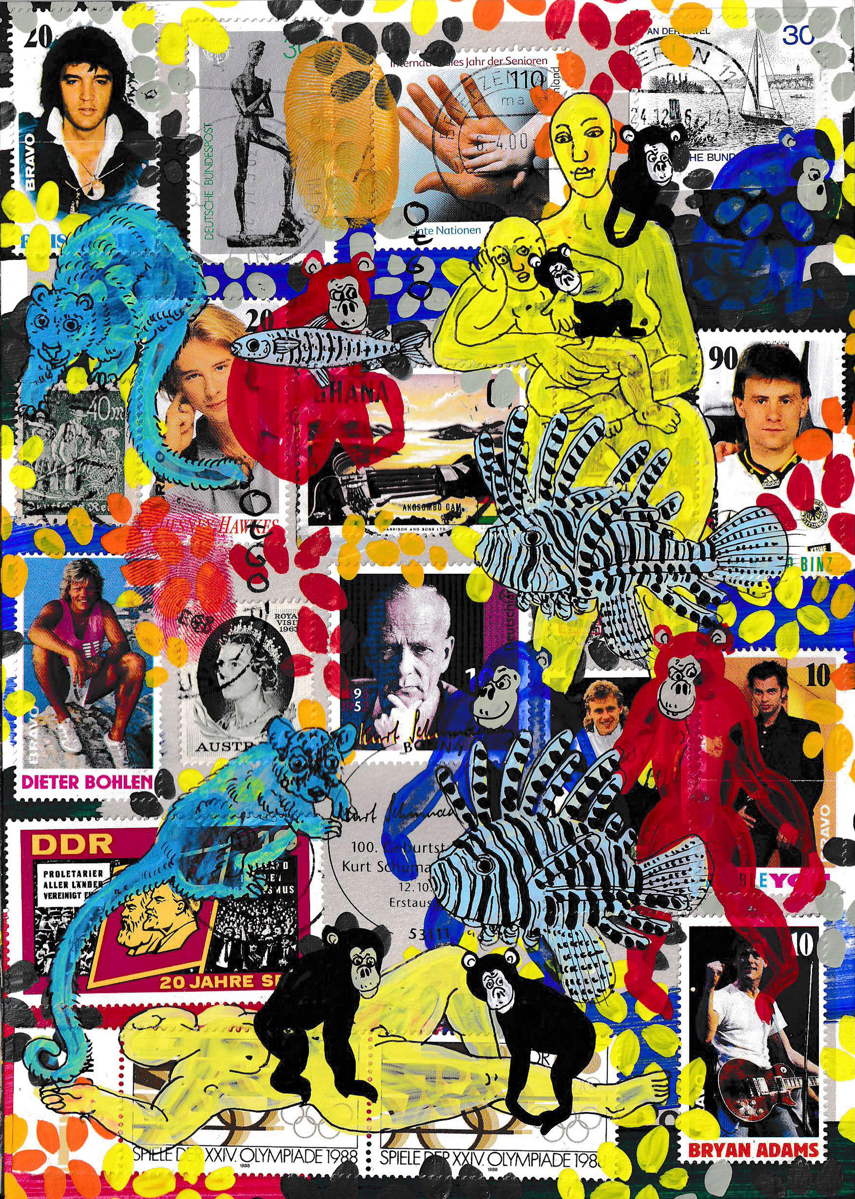 of 54 equal-sized single paintings, ink and acryl on original Stamps,