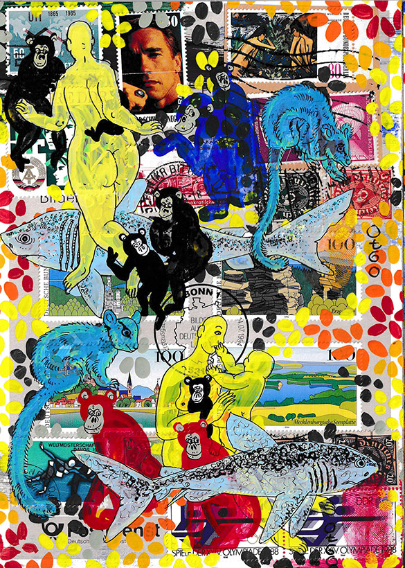 of 54 equal-sized single paintings, ink and acryl on original Stamps,