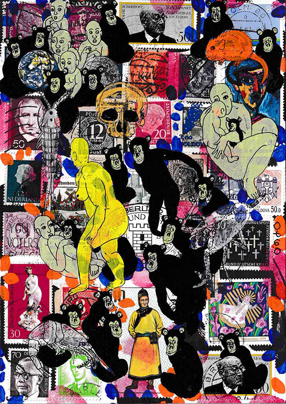 of Curiosities Apes 11 by OtGO 2024-2025, ink and acryl on original Stamps,