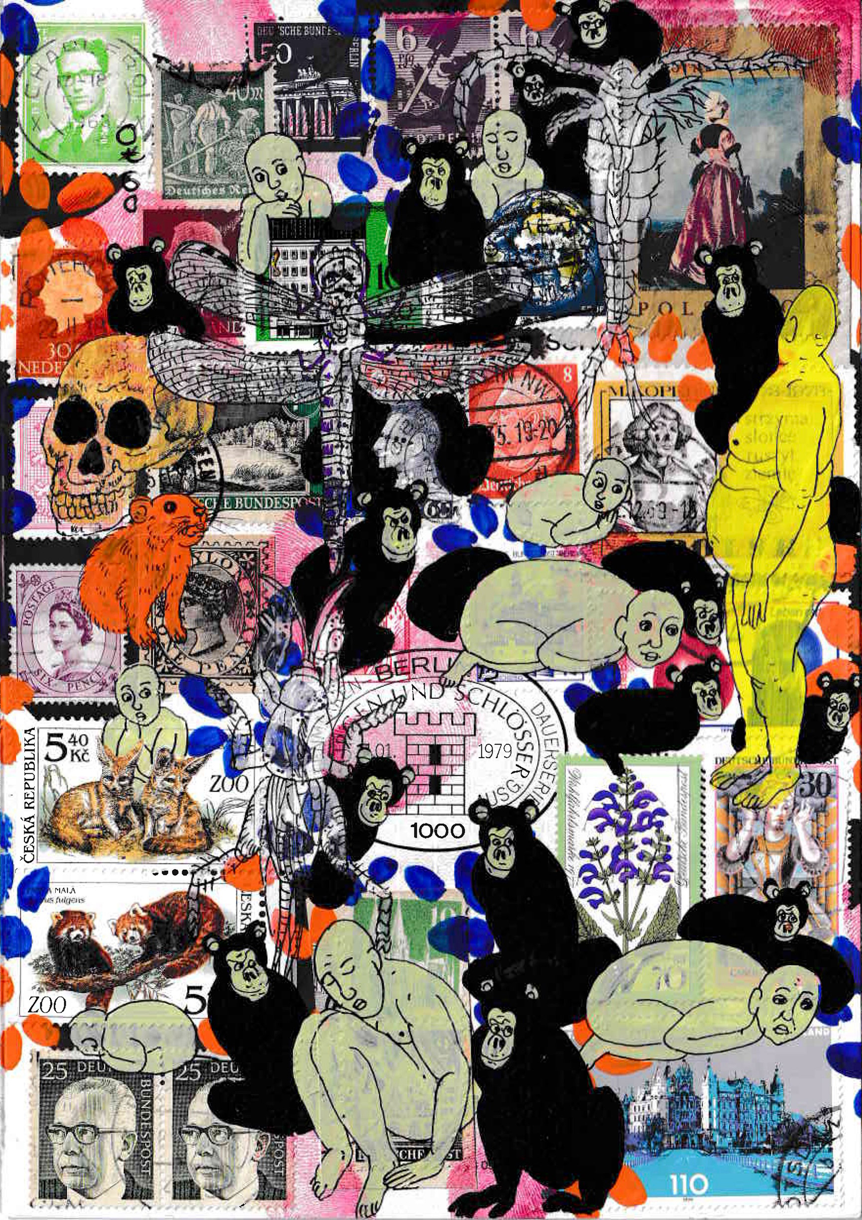 of Curiosities Apes 19 by OtGO 2024-2025, ink and acryl on original Stamps,