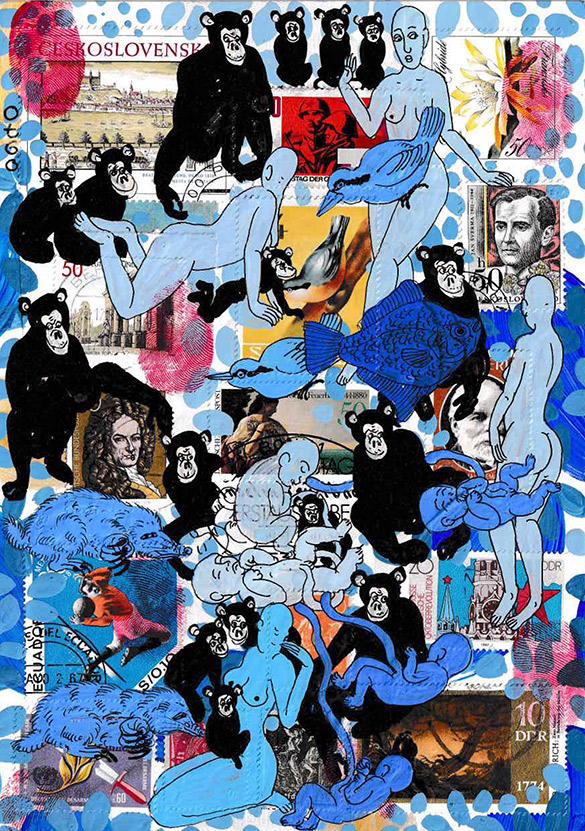of Curiosities Fetus 11 by OtGO 2021, ink and acryl on original Stamps, 210 x