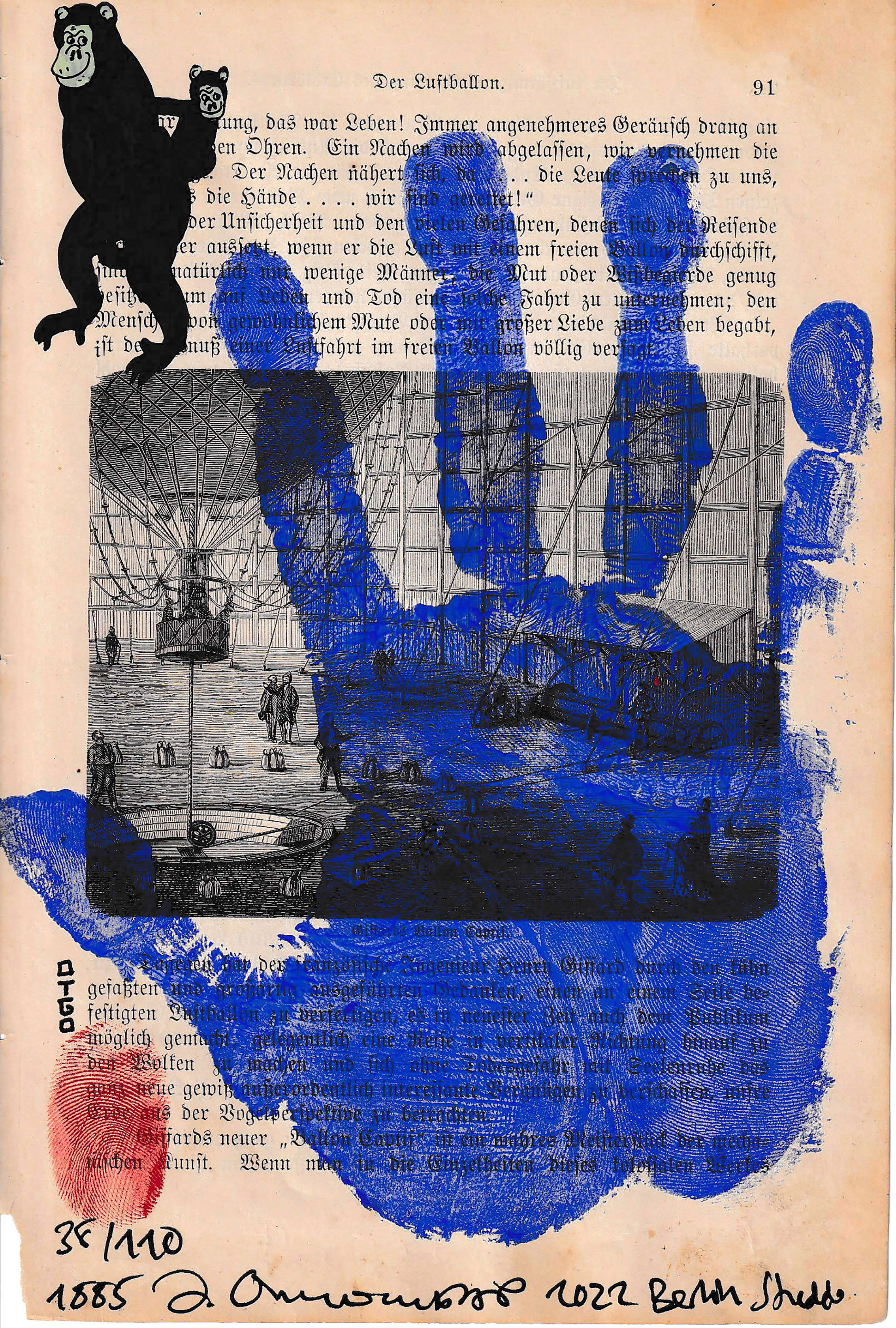 OtGO selected a total of 110 loose pages to use for his project. The imprint of his right hand can now be seen in bright blue on each sheet. He himself says: "I have a very special relationship with the leaves, because my handprint makes it very personal." On the one hand, the imprint is a kind of document from OtGO, on the other hand it also stands for his soul, which he thus gives to the old paper so that it continues to live on. Furthermore, one or two monkeys are painted on each page, which we already know from other paintings. OtGO was born in the year of the monkey and so he adds another part of himself to the pictures. The pages now tell new stories and travel to pass them on. OtGO has revived the old book, making it immortal.