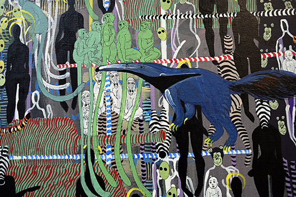 Comme à son habitude, OtGO a créé trois toiles d’une grande richesse. Très détaillées, les œuvres invitent les spectateurs à se rapprocher d’elles le plus possible, quitte à les toucher du bout du nez. Les détails des visages, des expressions et des mouvements deviennent perceptibles et les toiles dévoilent alors toutes les richesses qu’elles contiennent. En plongeant nos yeux dans les peintures de l’artiste, l’histoire commence. Animaux et poissons sauvages envahissent les toiles : différentes espèces de singes, tigres, zèbres, tamanoirs, raies. Les toiles grouillent de vie. Pourtant, au-delà des animaux exotiques et colorés, des masques apparaissent ; ils sont partout et seuls des yeux globuleux se dessinent à la surface des masques. L’absence de bouche, de nez, mais surtout d’émotions leur donne un aspect glaçant. Quant aux êtres humains, qui sont des sortes de silhouettes noires sans vie, ils errent, condamnés, dans le silence. D’autres sont transformés en silhouettes de différentes couleurs ou transparentes. Quand les premières gisent telles des poupées désarticulées, les secondent semblent disparaître peu à peu du monde et deviennent à peine perceptibles. Tout comme les masques, ces silhouettes n’ont plus de visages. Pour les premières comme les secondes, la disparition d’un corps ou la brisure d’une âme mènent au silence et à la mort.