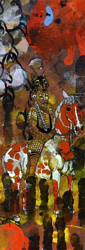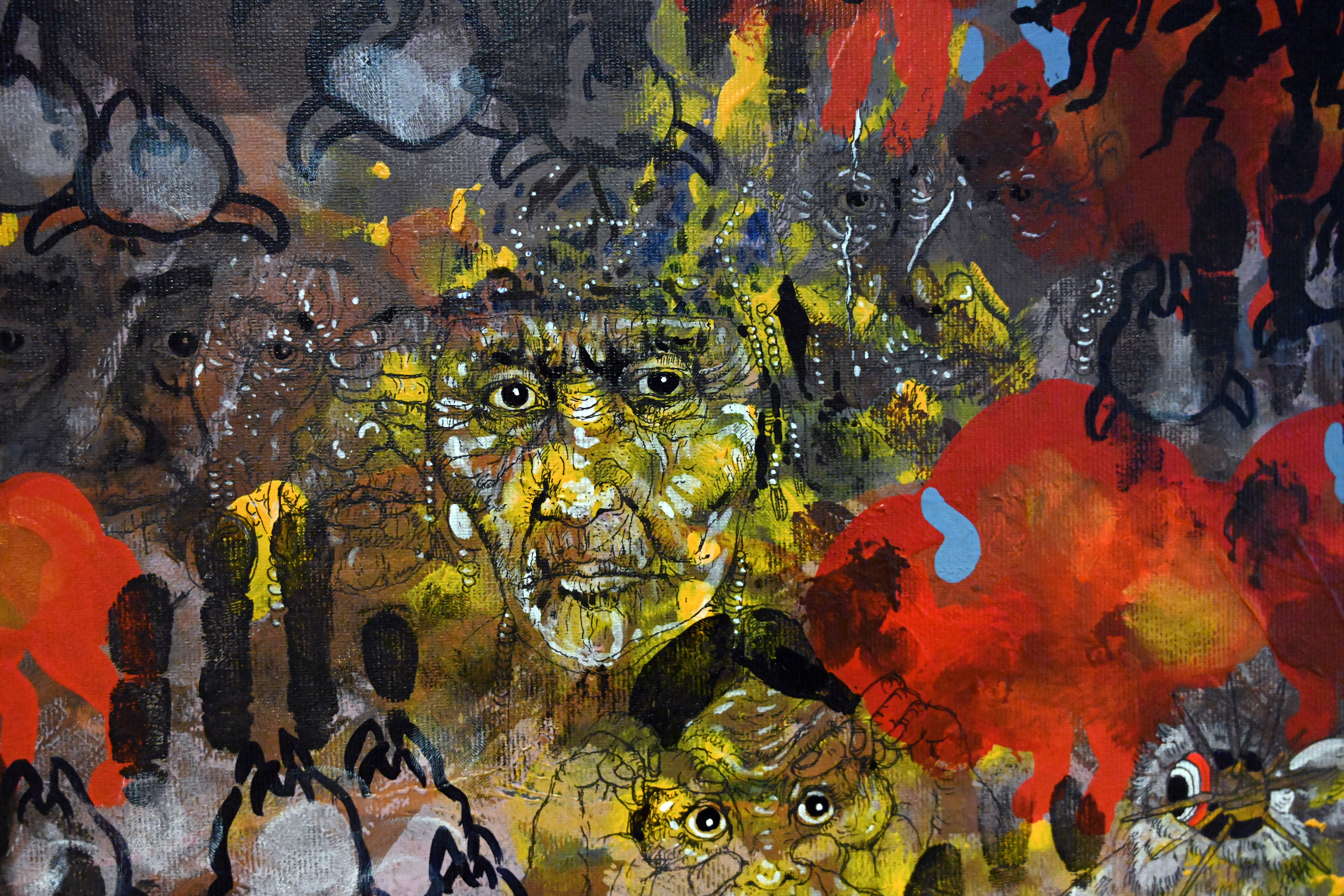 paintings dominated in a sombre, dark red color, and filled with