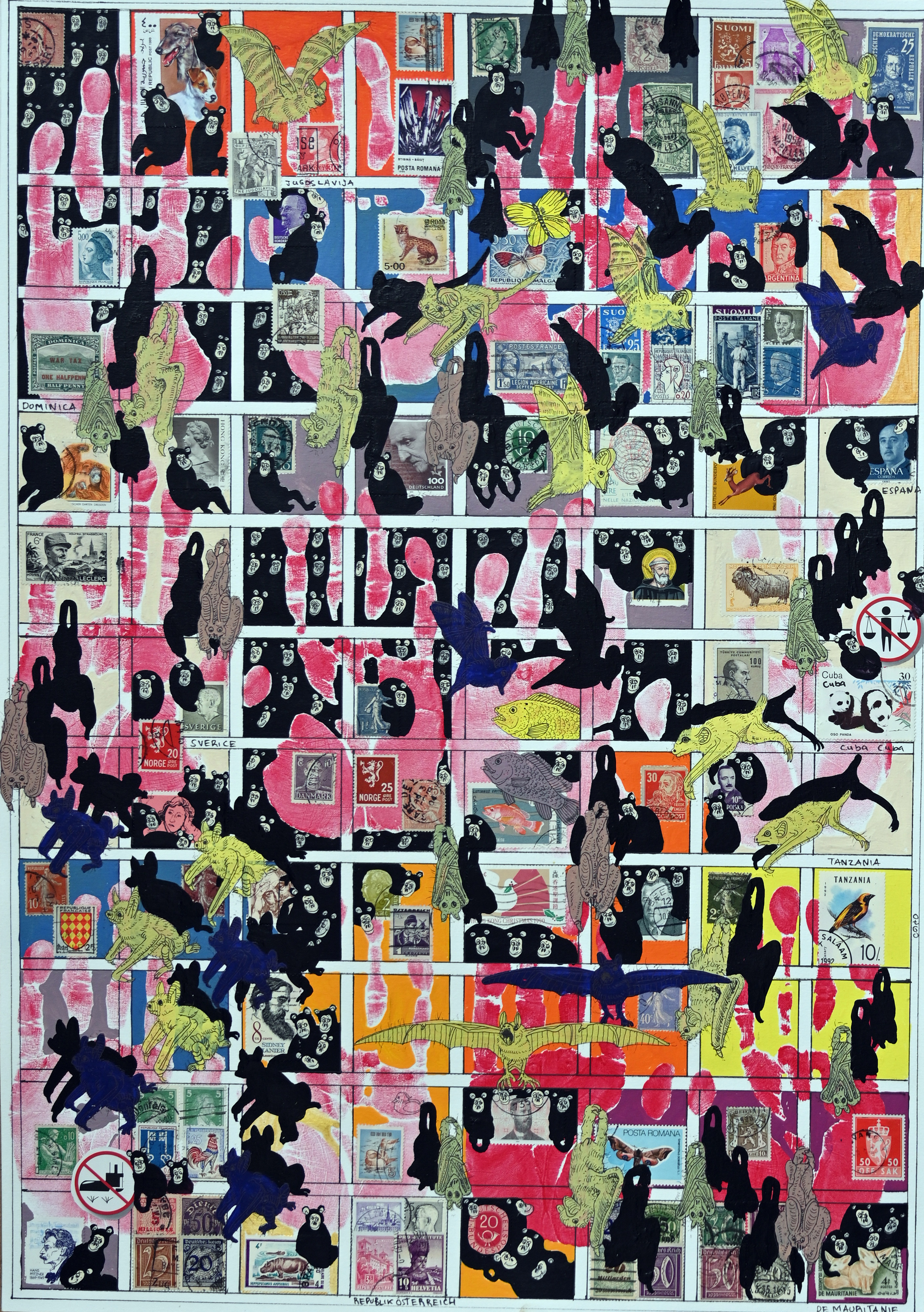 of Curiosities Salon 1/10 by OtGO 2024-2025, ink and acryl on original Stamps, 594 x 420 mm (A2) Cabinet