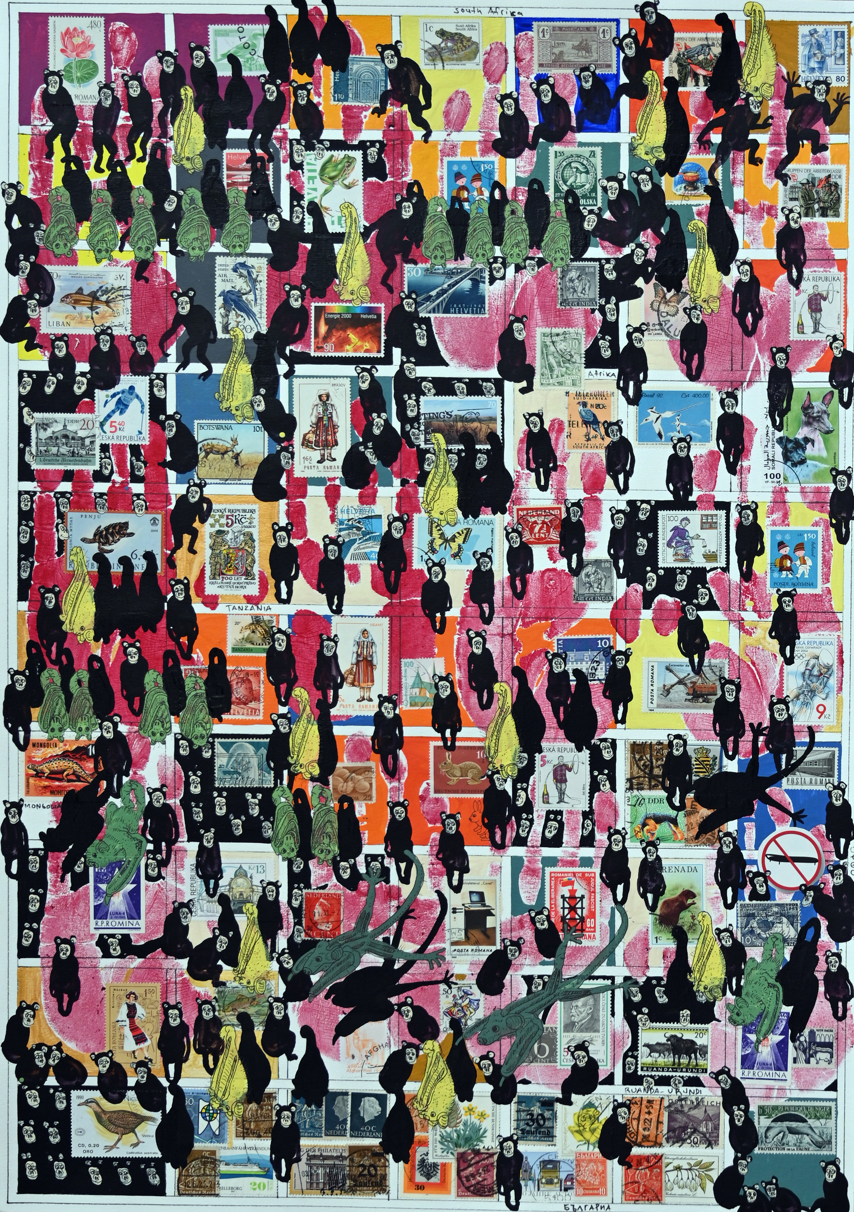 of Curiosities Salon 2/10 by OtGO 2024-2025, ink and acryl on original Stamps,