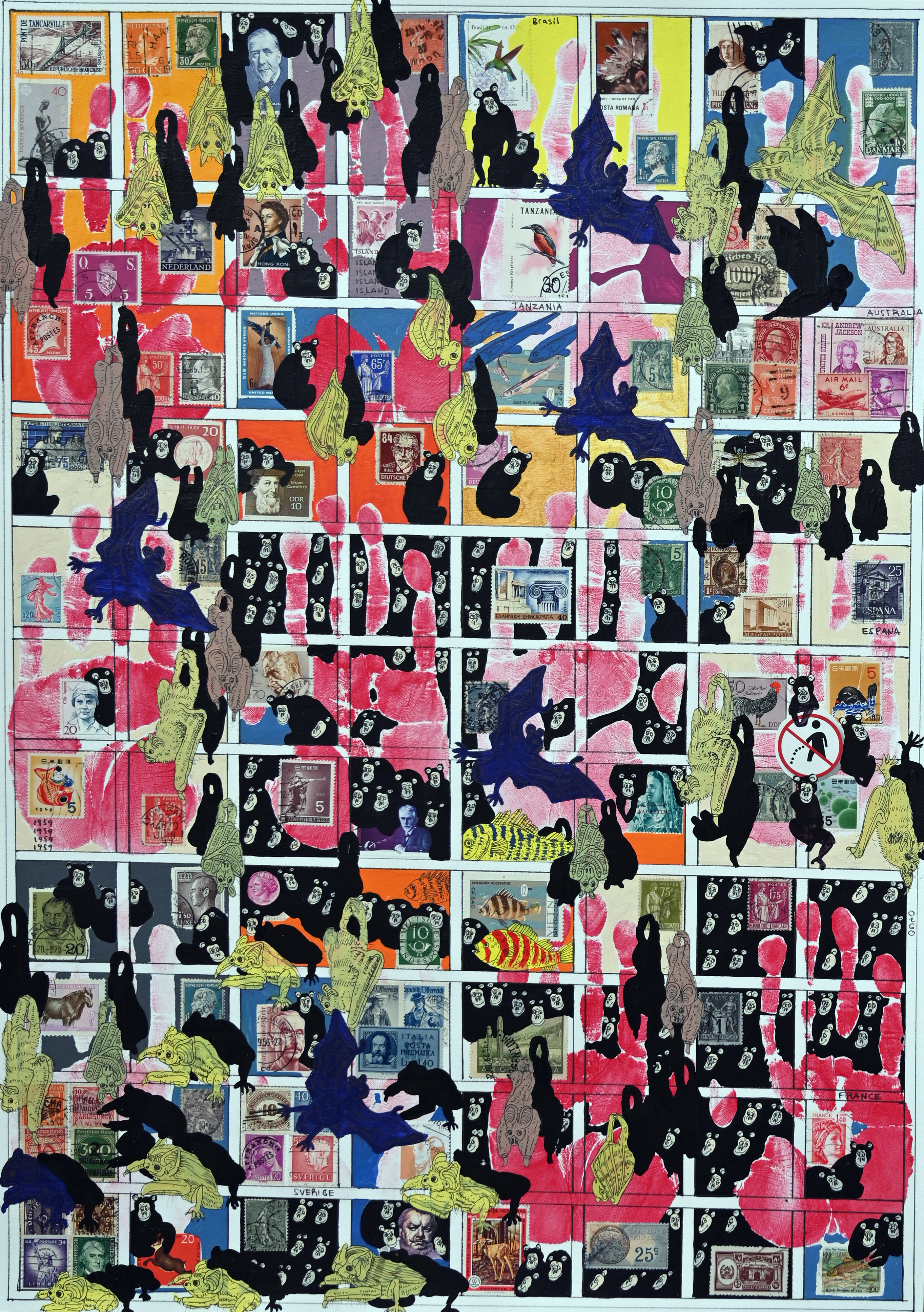 of Curiosities Salon 7/10 by OtGO 2024-2025, ink and acryl on original Stamps,