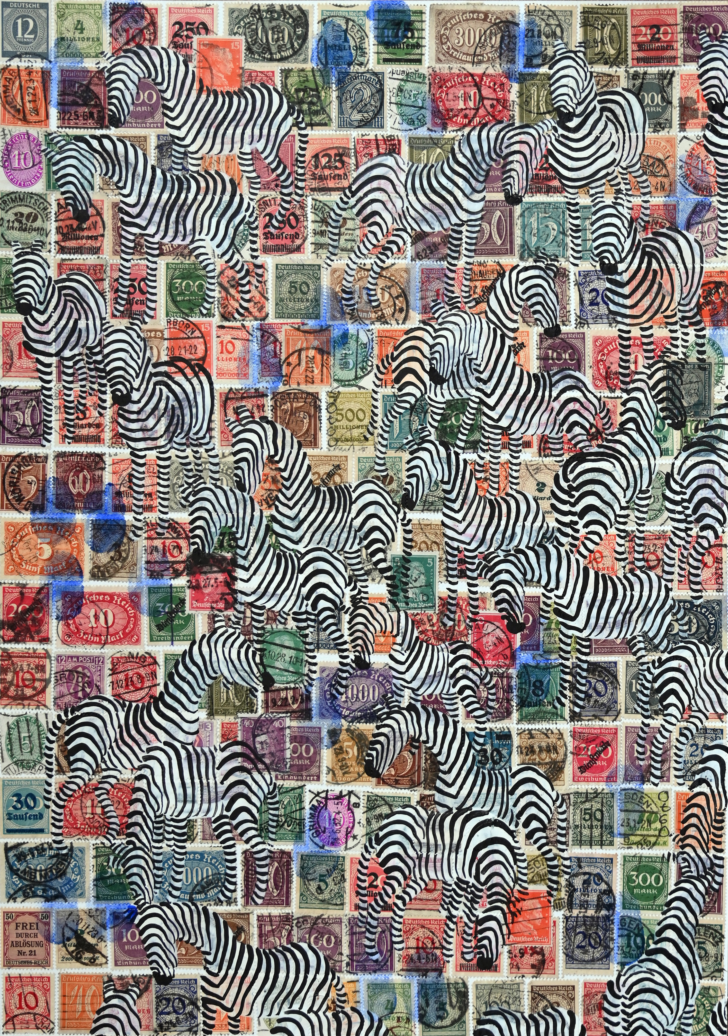 of 30 equal-sized single paintings, ink and acryl on original Stamps,
