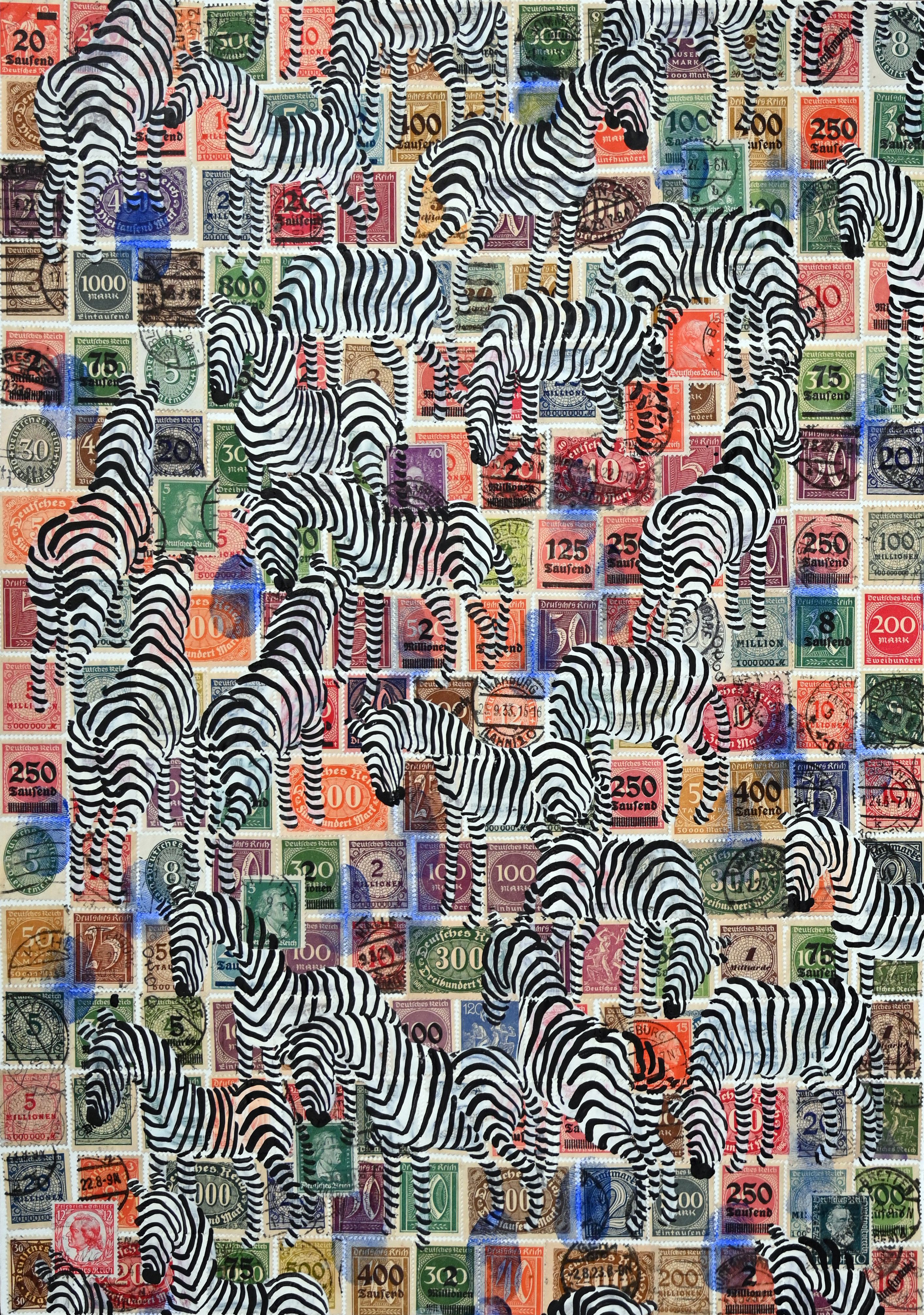of 30 equal-sized single paintings, ink and acryl on original Stamps,