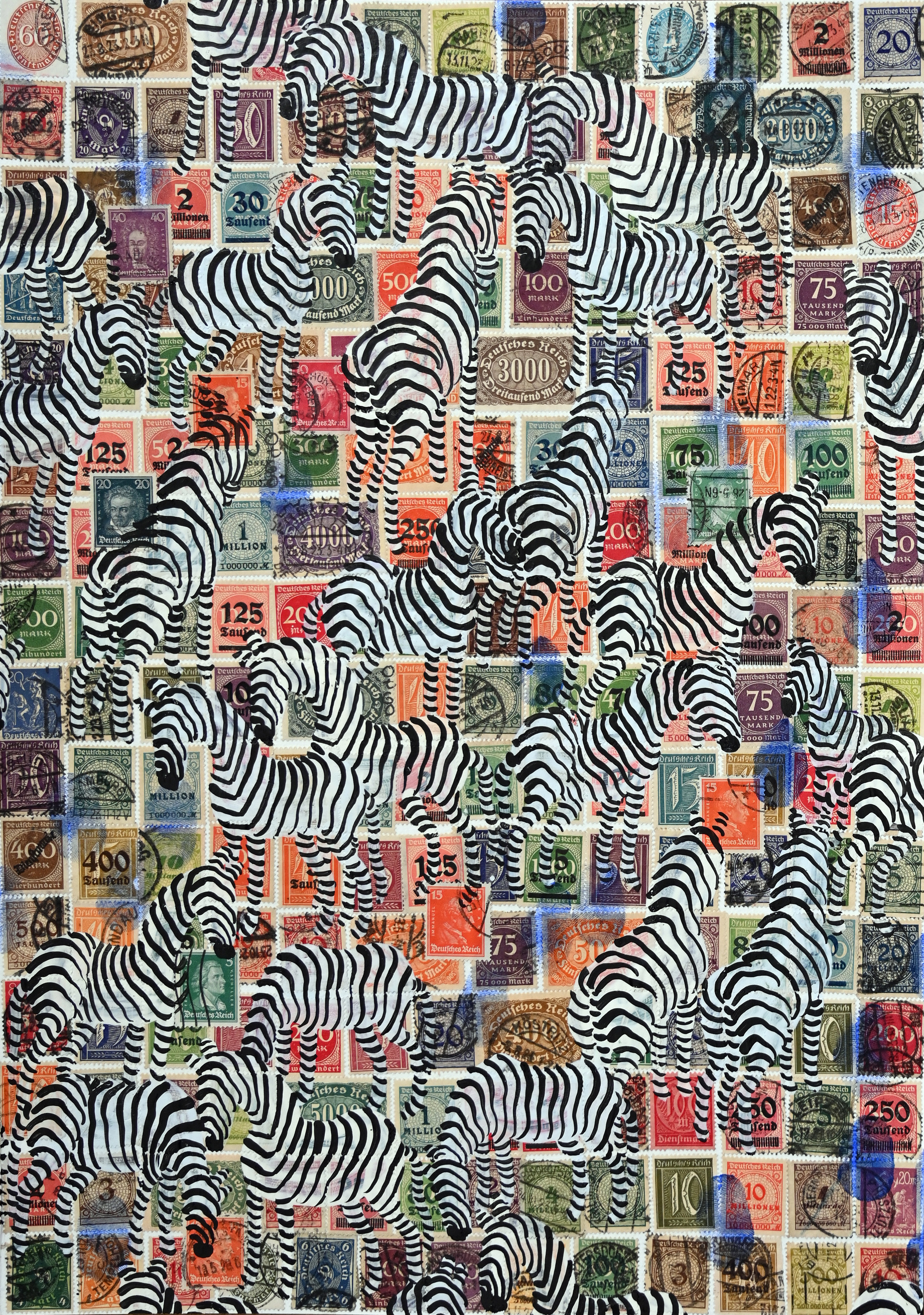of 30 equal-sized single paintings, ink and acryl on original Stamps,