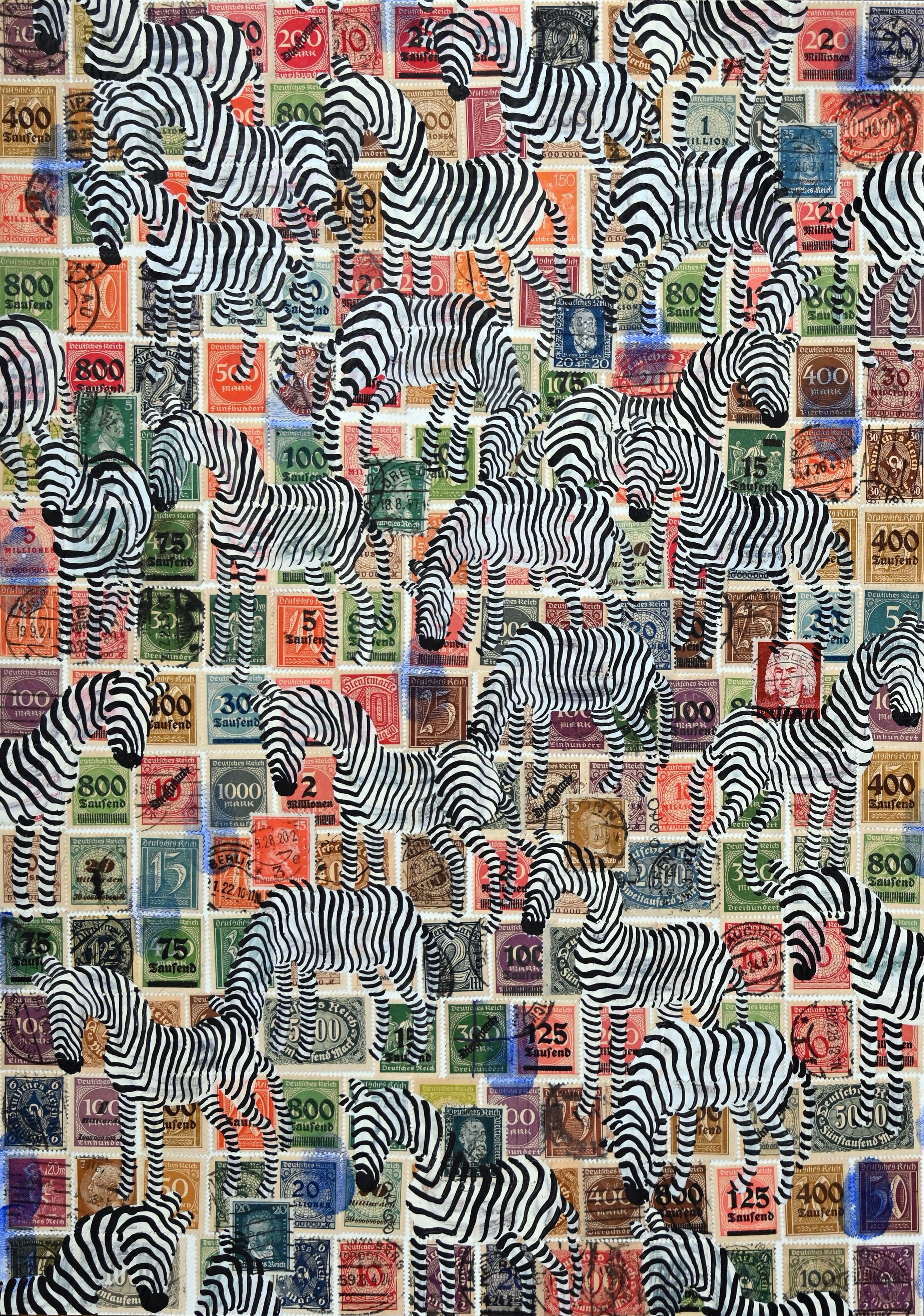of 30 equal-sized single paintings, ink and acryl on original Stamps,