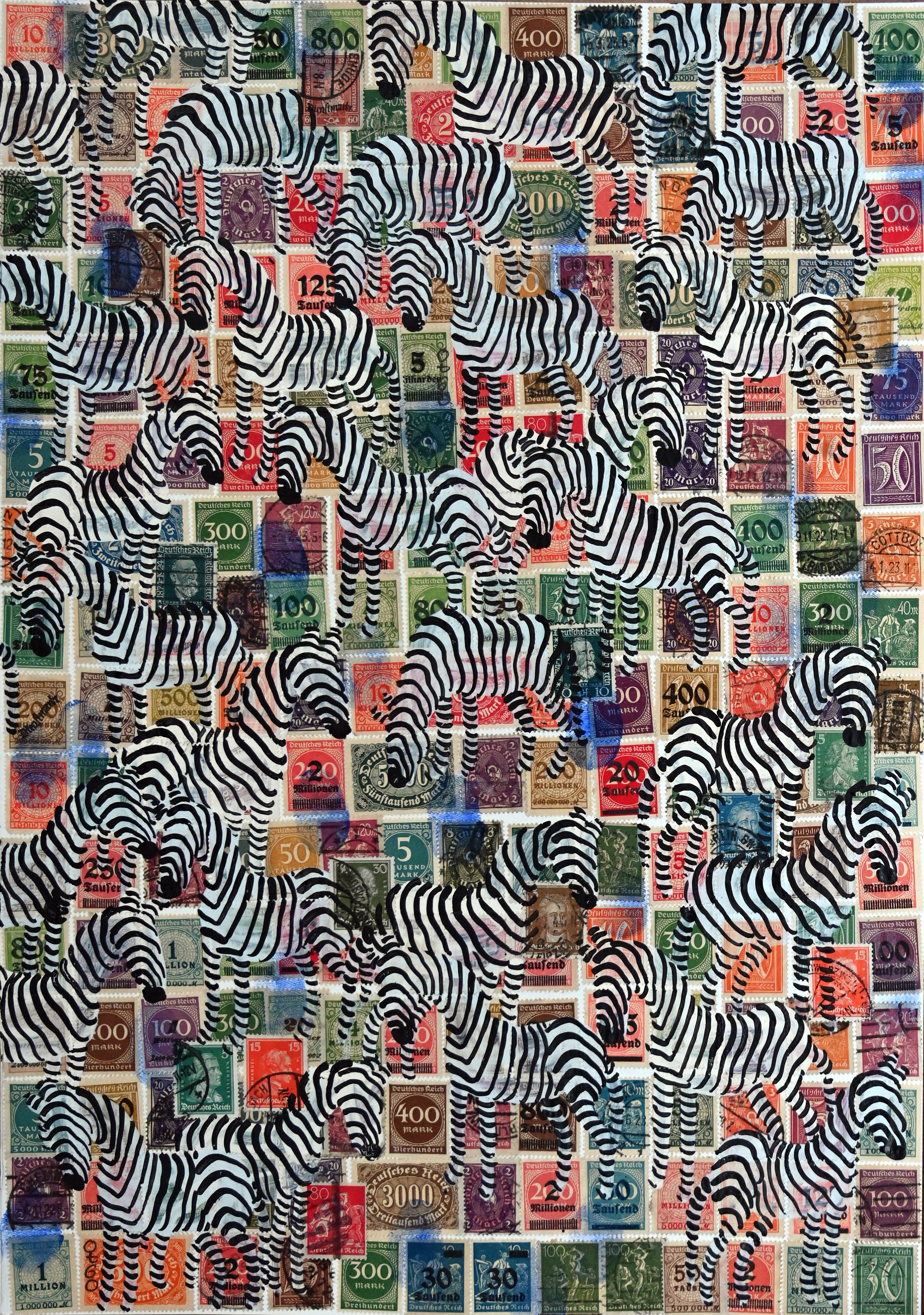 of 30 equal-sized single paintings, ink and acryl on original Stamps,