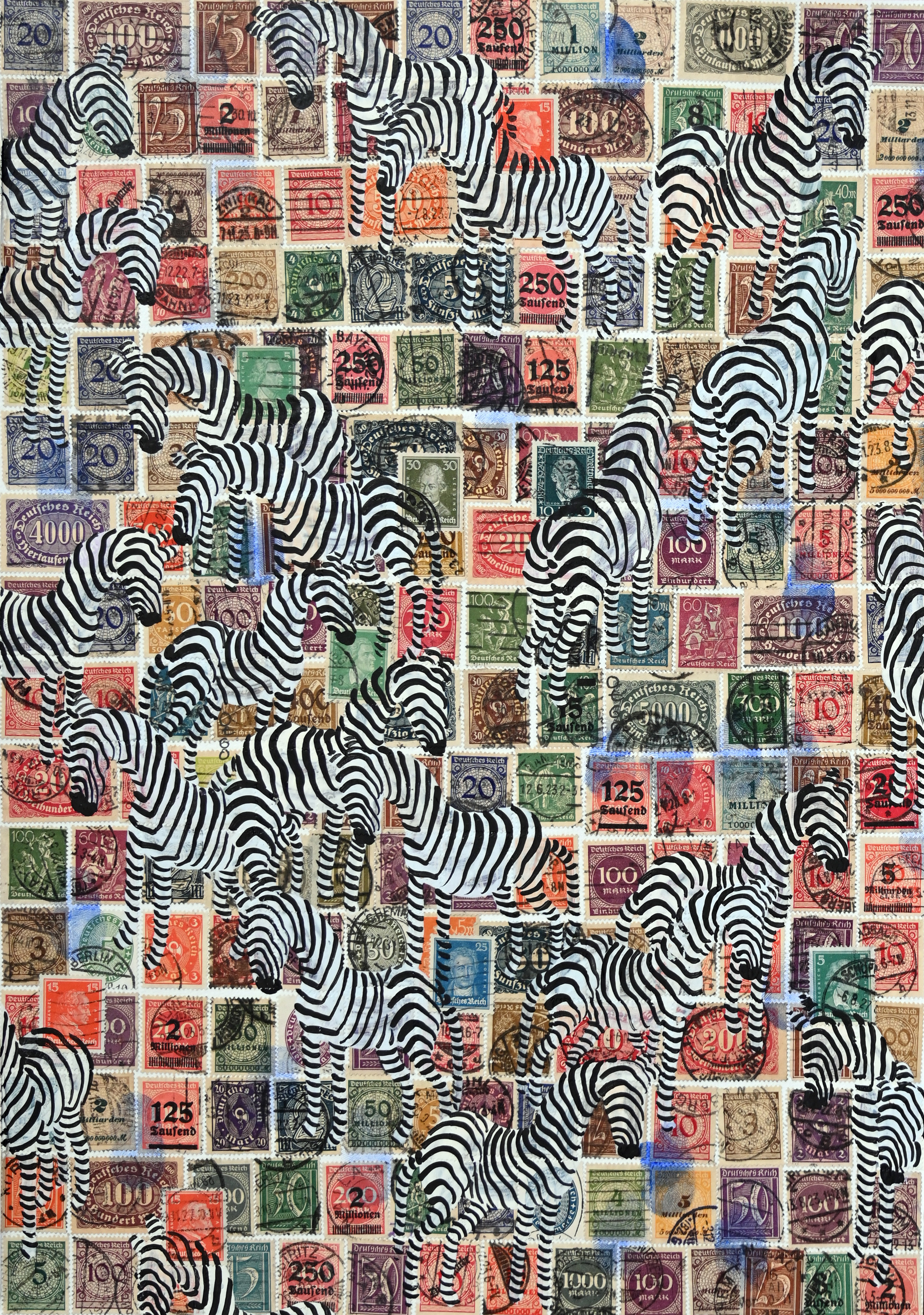 of 30 equal-sized single paintings, ink and acryl on original Stamps,
