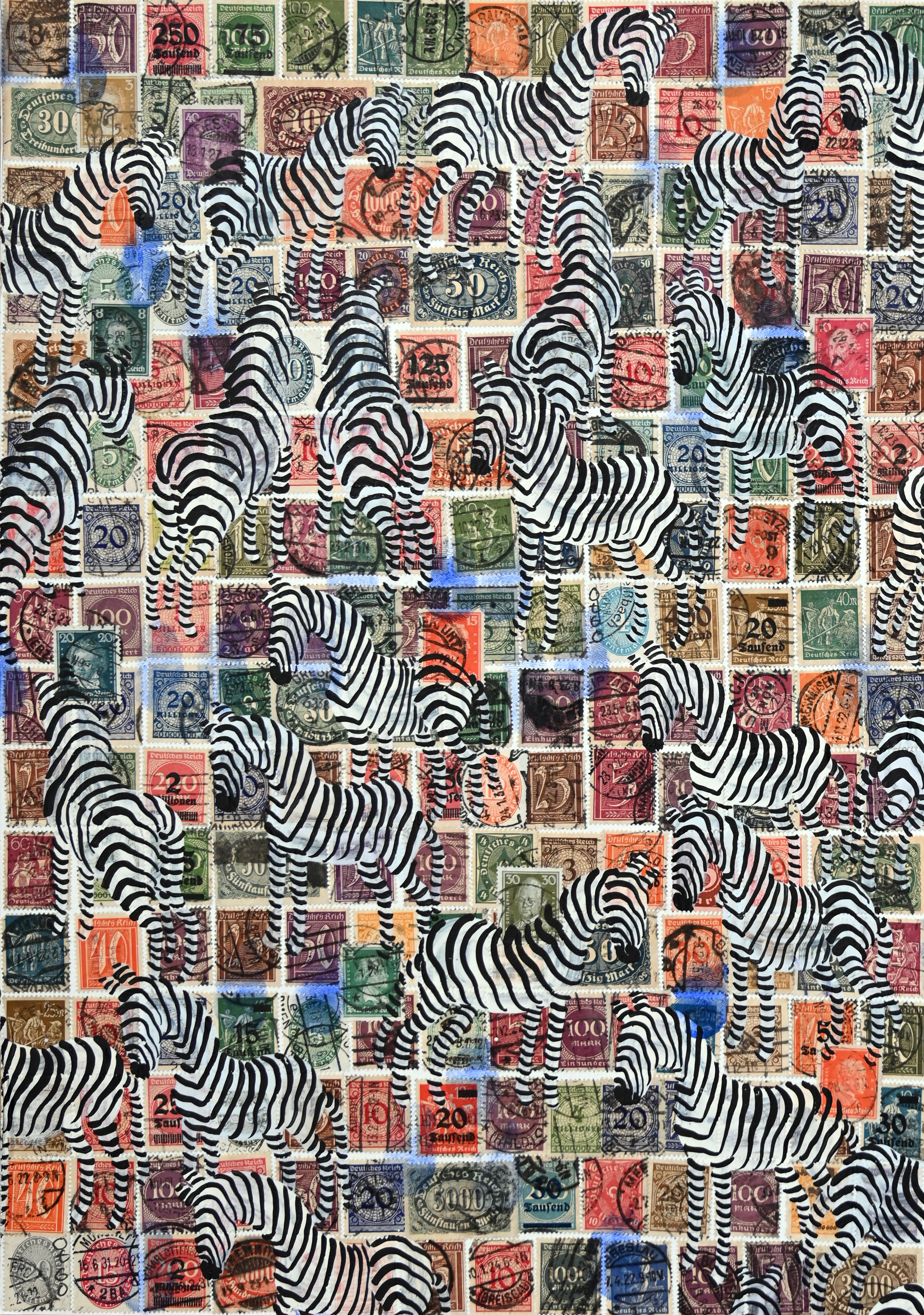 of 30 equal-sized single paintings, ink and acryl on original Stamps,