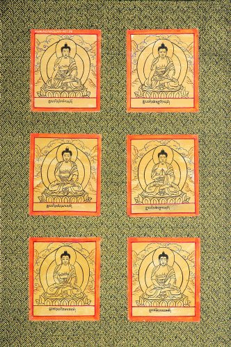 Tempera auf Baumwolle, je 6x7cm, Jahr 1998-2001 Adibuddha Ein Adibuddha ist ein transzendenter Buddha, der als Verkörperung absoluter Wahrheit gilt (s.a. Dharma-Philosophische Bedeutung). Adibuddha bedeutet Urbuddha und er gehört dem Dharmakaya, der Ebene der dualitätsfreien, gleichzeitig transzendenten und immanenten absoluten Wahrheit und Wirklichkeit an, die das Wesen aller Buddhas ausmacht. Die Idee des Adibuddha soll im 6./7. Jahrhundert entstanden sein und wurde aus dem Tantrayana in den Mahayana-Buddhismus übernommen. Am bekanntesten sind die „fünf großen transzendenten Buddhas“ (auch: Dhyani-Buddhas; tib.: sku lnga rgyal po) Vairocana, Akshobhya, Amitabha, Ratnasambhava und Amogasiddhi. Die Typologie der fünf Buddha-Familien (Buddhakula) bildet auch die Grundstruktur der in der Sadhana visualisierten Gottheiten. Vairocana Der bekannteste Adibuddha ist Vairocana (Sanskrit: वैरोचन, lautlich-angelehnt chin. 毘盧遮那佛, Piluzhenafo, jap. Birushana-butsu, kor. Birokana bzw. semantisch-angelehnt 大日如來 / 大日如来, Dàrì Rúlái, jap. Dainichi Nyōrai, tib.: རྣམ་པར་སྣང་མཛད། rNam-par-snang mdzad, Mongolisch: Teyin böged geyigülügci, viet.: Đại Nhật Như Lai; „Der Sonnengleiche“), der das Zentrum des höchsten Mandala beherrscht. Er durchstrahlt das Weltall und gilt als allwissend (Sarvavid). Er vereint die Weisheit aller Buddhas in sich und gilt auch als kosmischer Buddha, der alles bedingt. Vairocana ist der Herr der Buddha-Familie und wandelt, wenn man auf die Buddhas dieser Buddha-Familie meditiert, Unwissenheit (Avidya) in die Natur aller Buddhas, die Weisheit der endgültigen Verwirklichung um. Er wird manchmal mit vier Gesichtern dargestellt, mit denen er in alle Weltgegenden schaut. Sein Symbol ist eine Sonnenscheibe und seine Mudra ist der von der linken Hand umschlossene rechte Zeigefinger als Symbol der Vereinigung der Gegensätze. Im chinesischen Hua-yen und im japanischen Shingon spielt Vairocana eine große Rolle und wird kultisch verehrt. Er ist im Mandala umgeben von hundertdreiundsechzig Erscheinungen des Pantheon, zu denen die Buddhas der vier Himmelsrichtungen, Akshobya, Amitabha, Ratnasambhava und Amoghasiddhi, die Tathagatas, die der Sambhogakaya-Ebene angehören, gehören. Akshobhya Akshobhya (tib.: mi bskyod pa; „Der Unerschütterliche“) ist das Oberhaupt der Buddhas der Vajrafamilie. Die Buddhas der Vajrafamilie sind dem Störgefühl Zorn zugeordnet und wandeln es, wenn man auf die Formen dieser Familie meditiert in spiegelgleiche Weisheit um. Er wird dem Osten zugeordnet. Sein Reines Land heißt Abhirati. Vajrasattva In Nepal und Nordindien wird der Sambhogakaya-Buddha Vajrasattva (tib.: rdo rje sems dpa' (Dorje Sempa); „Diamantgeist“) oft anstelle von Akshobhya als Adibuddha und höchster transzendenter Buddha der Vajrafamilie verehrt. Der Sambhogakaya-Körper ist eine Art Lichtkörper oder besser, feinstofflicher Körper den Buddhas annehmen, um verwirklichten Yogis und Bodhisattvas zu erscheinen. Er kann von gewöhnlichen fühlenden Wesen nicht oder nur begrenzt wahrgenommen werden. Vajrasattva bedeutet, „der den Vajra zum Wesen hat“. Er trägt den Schmuck des Sambhogakaya und wird daher mit einem fünfzackigen Kopfschmuck, Halskette und Armreifen abgebildet. Er hält in der rechten Hand den Vajra und in der linken Hand die Glocke (ghanta) als Versinnbildlichung der Vereinigung von Gegensätzen, da der Vajra männlich ist und das Mitgefühl symbolisiert, während die Glocke weiblich ist und Weisheit verkörpert. Vajrasattva gilt als der Buddha, der die Reinheit aller Buddhas von karmischen Schleiern verkörpert. Die Praxis auf Vajrasattva ist daher eine der wichtigsten tantrischen Reinigungspraktiken. Vajrasattva ist von großer Bedeutung bei der Übertragung des Dzogchen, der Große Vollkommenheit, die insbesondere in der Nyingma-Schule des tibetischen Buddhismus als Essenz der Lehren Buddhas weitergegeben werden. Amitabha Der „Buddha des grenzenlosen Lichts“ ist Herr der Buddhas der Lotusfamilie und thront im Reinen Land von Sukhavati. Die Buddhaformen der Lotusfamilie sind dem Störgefühl Gier zugeordnet und wandeln es in den dem Störgefühl zugrundeliegenden Weisheitsaspekt unterscheidende Weisheit um. Er wird dem Westen zugeordnet. Wichtige Sambhogakaya-Ausstrahlungen von Amitabha sind der Bodhisattva Avalokitesvara und der Buddha des langen Lebens Amitayus. Padmasambhava wird als eine Inkarnation von Amitabha angesehen, Buddha Shakyamuni ebenfalls. Ratnasambhava Ratnasambhava (tib.: rin chen 'byung gnas) ist Herr der Buddhas der Ratna (Juwel)-Familie. Die Buddhas der Ratna-Familie wandeln Stolz in ausgleichende Weisheit um. Er wird der südlichen Weltgegend zugeordnet. Amoghasiddhi Amoghasiddhi (tib.: don yod grub pa), der Buddha der nördlichen Weltgegend ist Herr der Buddhas der Karmafamilie und verwandelt Neid/Eifersucht in allesvollendende Weisheit. So auch die Bedeutung seines Namens: „Der die Weisheit vollendet“. Im Volksglauben gilt er als Erfolgsbringer. Das Symbol dieser Familie ist der Doppelvajra. Besondere Urbuddhas des Vajrayana Samantabhadra Eine weitere im wesentlichen nur im Vajrayana verehrte Form des Adibuddha ist Samantabhadra (tib.: Kuntuzangpo), „der All-Gute“ oder auch „der ringsum Segensreiche“ oder „der Herr der Wahrheit“. Er erscheint nackt, ohne Attribute und symbolisiert die uranfängliche Erleuchtetheit des Geistes selbst, sowie die Praxis und Meditation aller Buddhas. Nach der Überlieferung des tibetischen Buddhismus war Samantabhadra nie in Samsara eingetreten. Samantabhadra steht in engem Zusammenhang mit den Lehren des Dzogchen (der „Großen Vollkommenheit“) und wird daher besonders in der Nyingma-Schule verehrt. Der Impuls zur Übertragung der Lehren des Dzogchen wurde von dem Dharmakaya-Buddha Samantabhadra an die Sambhogakaya-Form (erleuchtete Energie-Ebene) Vajrasattva (tib. Dorje Sempa) übermittelt. 