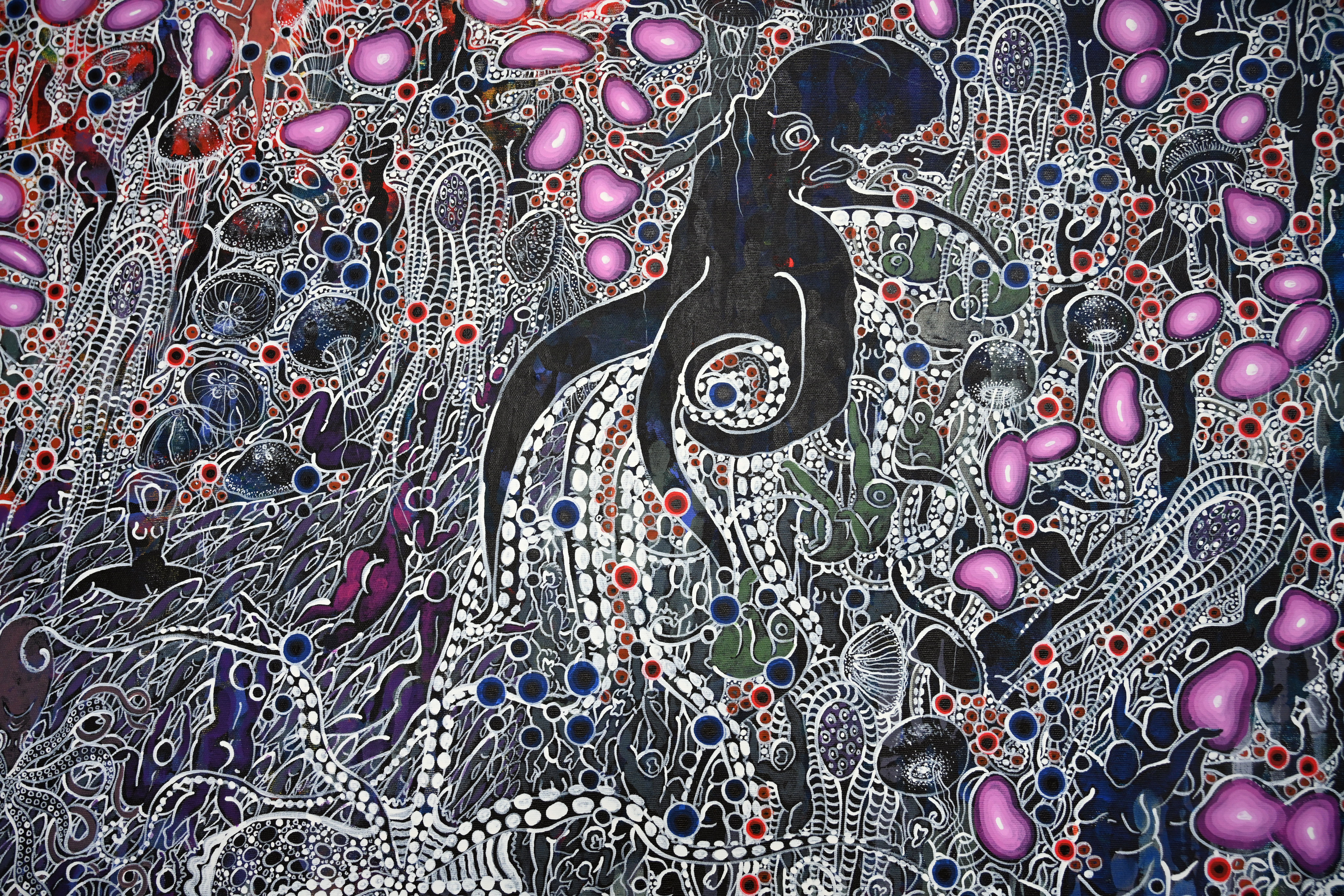 Seine tiefe Empfindsamkeit für die Natur, sein Spürsinn gegenüber Lebewesen jeglicher Art prägen auch seine Bilder, die in tiefer, stundenlanger Versunkenheit aus seinem Bauchgefühl heraus entstehen. Pinselstrich für Pinselstrich einmal gemalt und gesetzt entsteht ein unglaubliches Dickicht aus menschlichen Figuren, tierischen Körpern, filigranen Mustern, die in Form und Farbe von Weitem betrachtet, eine innere Dynamik zeigen – wie sie sich geradezu herdenhaft in Wellen über die Leinwand zu bewegen scheinen.